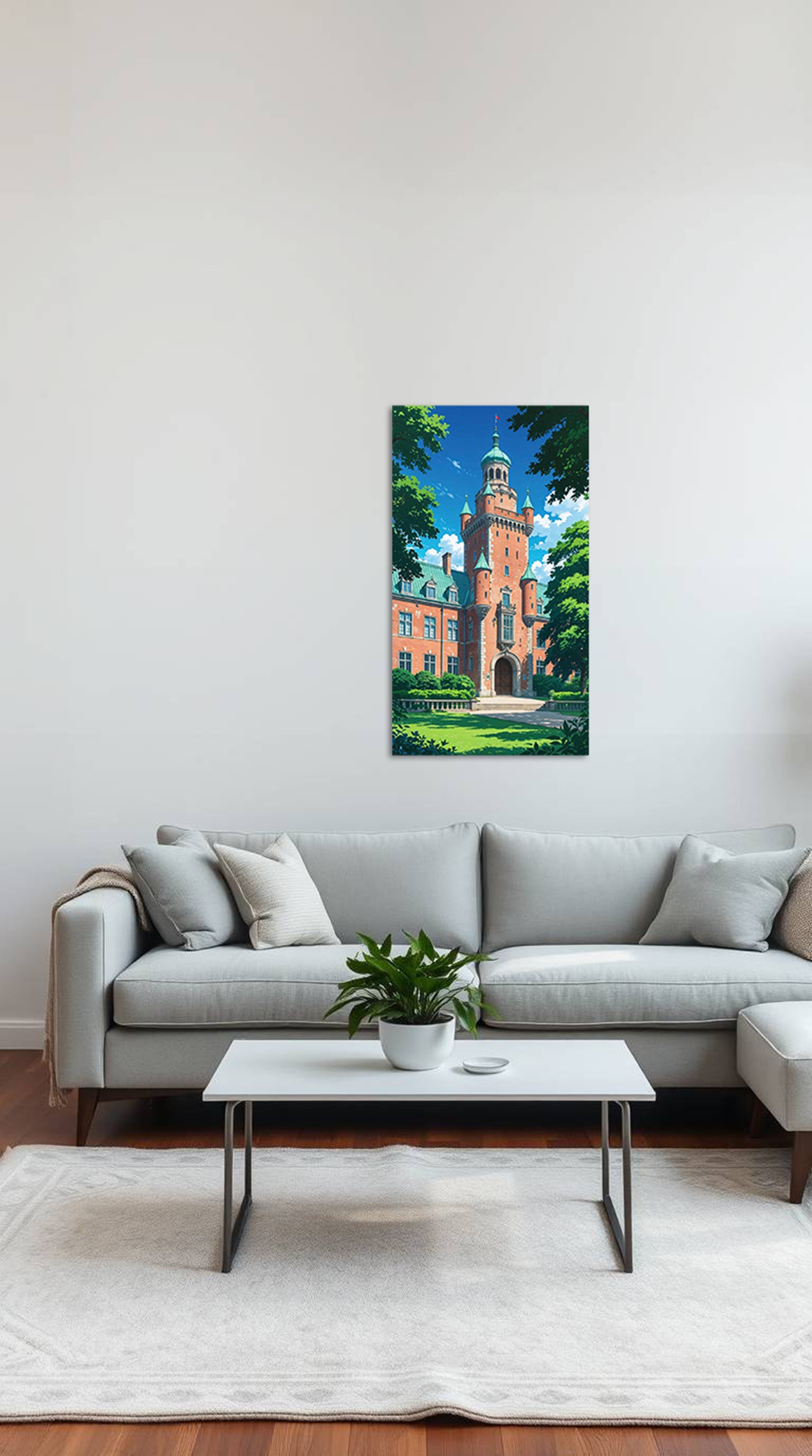 Bring regal charm into your home with this stunning metal poster featuring a historic Nordic castle. Its red brick towers and green copper spires stand proudly under a vivid blue sky, evoking timeless elegance and Scandinavian strength. Printed on premium aluminum for exceptional detail and brilliance.