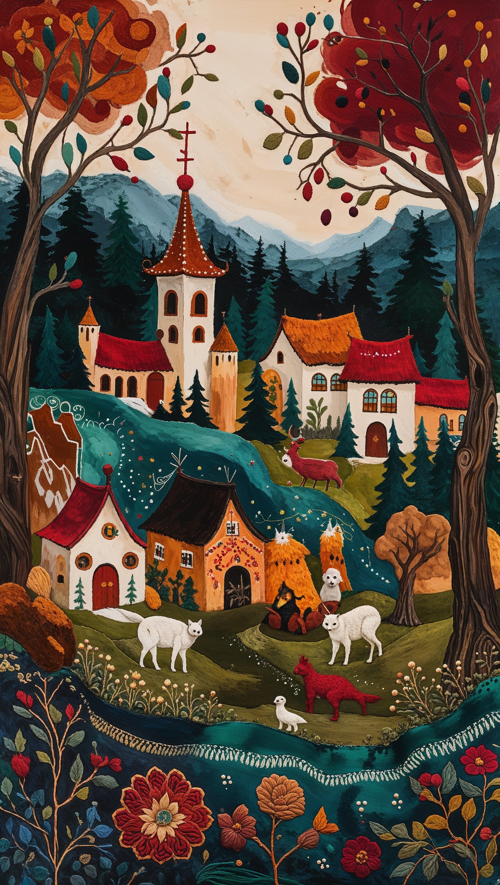 Step into the vibrant and mystical Enchanted Valley, a richly detailed folk-art tapestry bursting with life, color, and woodland magic. Nestled among rolling hills and forest trees, charming cottages and majestic deer coexist in harmony with birds, flowers, and mythical creatures. The scene radiates a cozy, storybook warmth that feels both timeless and whimsical.