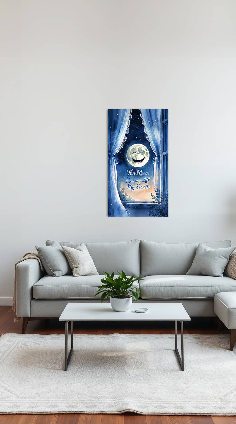 Gaze out the midnight window into a dreamy sky where the moon smiles knowingly through lace-curtained panes. This whimsical aluminum poster, Moon knows all my secrets, captures a serene yet playful moment under the stars, reminding you that the moon has heard every whispered thought and secret wish. Perfect for bedrooms, cozy nooks, or any space that craves a touch of magic and comfort.
