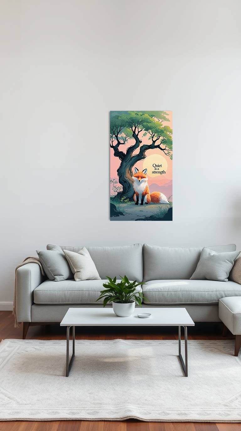 A serene fox rests beneath an ancient tree as the sun sets behind distant hills. With the calming quote “Quiet is a strength”, this beautifully illustrated aluminum poster celebrates stillness, resilience, and inner peace. Perfect for introverts, nature lovers, or anyone who finds power in calmness. Bring a touch of quiet strength to your home, office, or meditation space.