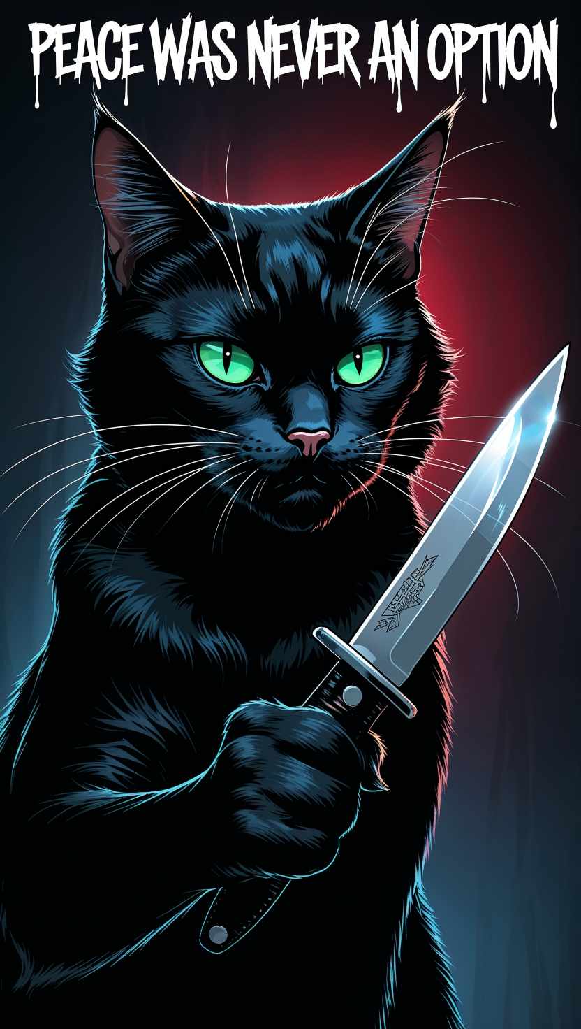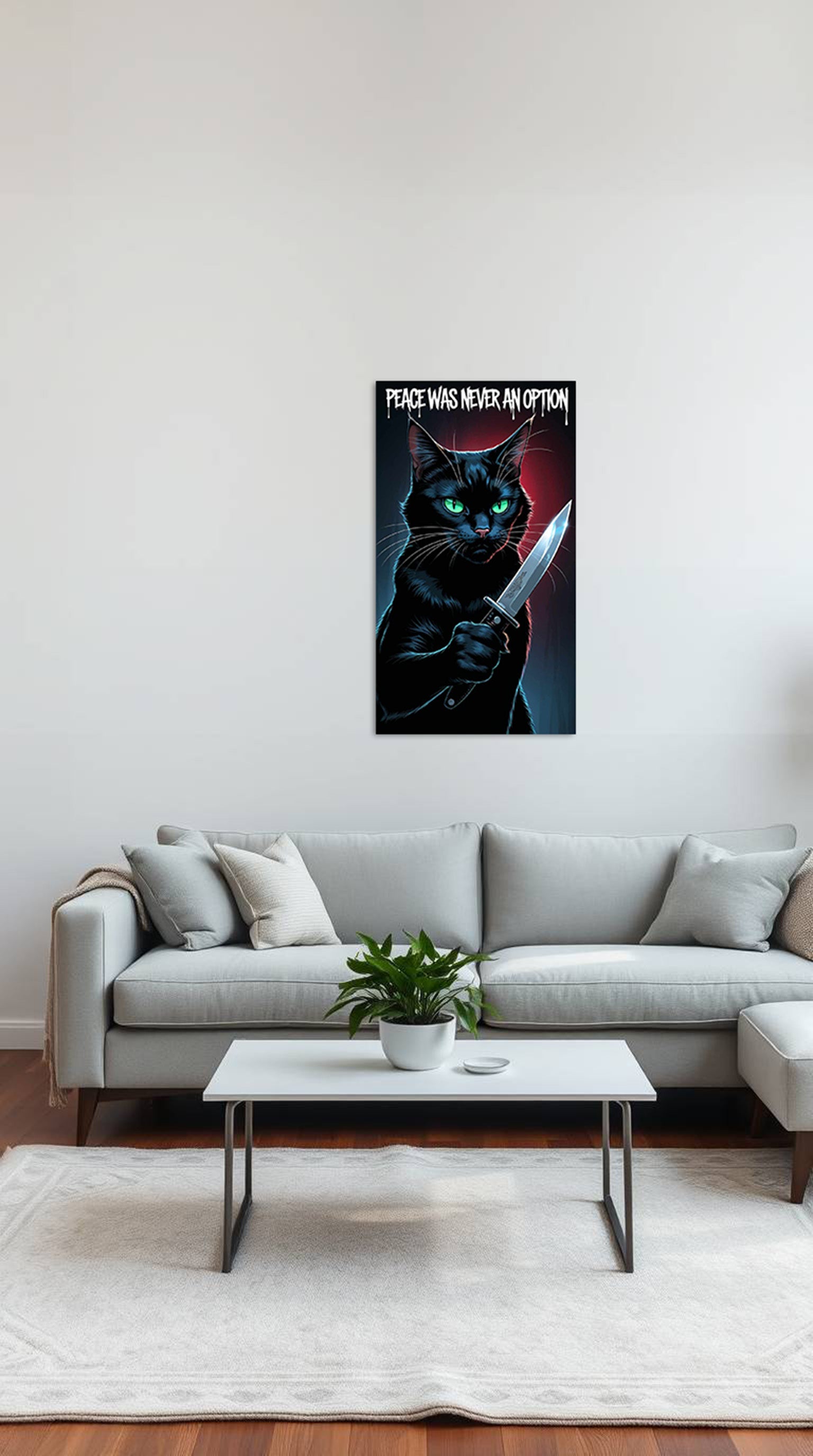 Unleash your inner chaos with this badass black cat metal poster. Featuring fierce green eyes and a knife-wielding pose under the phrase “Peace Was Never an Option,” it’s the ultimate piece for cat lovers with attitude. Printed on premium aluminum for intense colors and a sleek, lasting finish.
