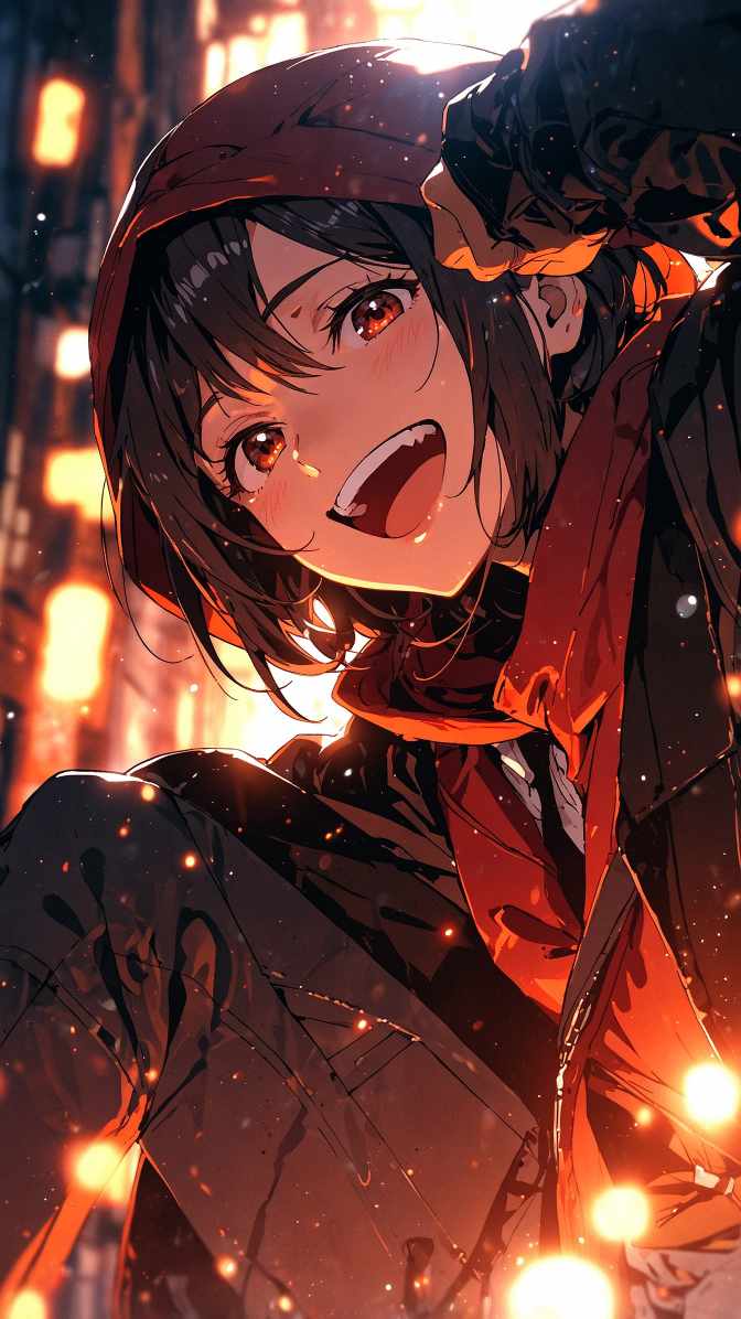 Bring bold energy to your space with this vibrant anime poster featuring a cheerful girl in a red hood, captured with stunning warm city lights and glowing embers around her. Her joyful expression radiates confidence, warmth, and unstoppable spirit. Perfect for anime fans wanting to brighten their room, gaming setup, or studio with inspiring character art printed in crisp high resolution on premium aluminum for long-lasting brilliance.