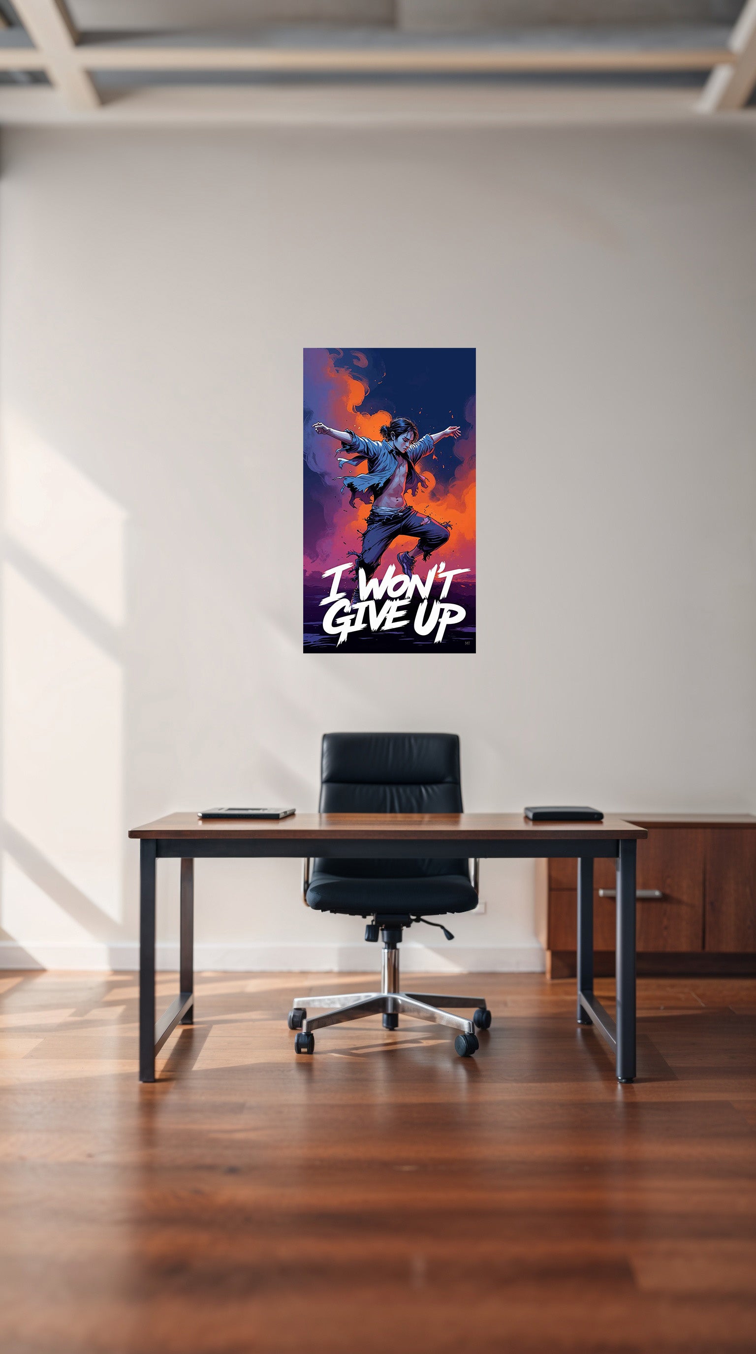 Fuel your determination with this striking metal poster. Featuring bold artwork of resilience and the empowering words “I Won’t Give Up,” it’s perfect for your gym, office, or personal space. Printed on premium aluminum for vibrant colors and a sleek, durable finish that motivates you every day.